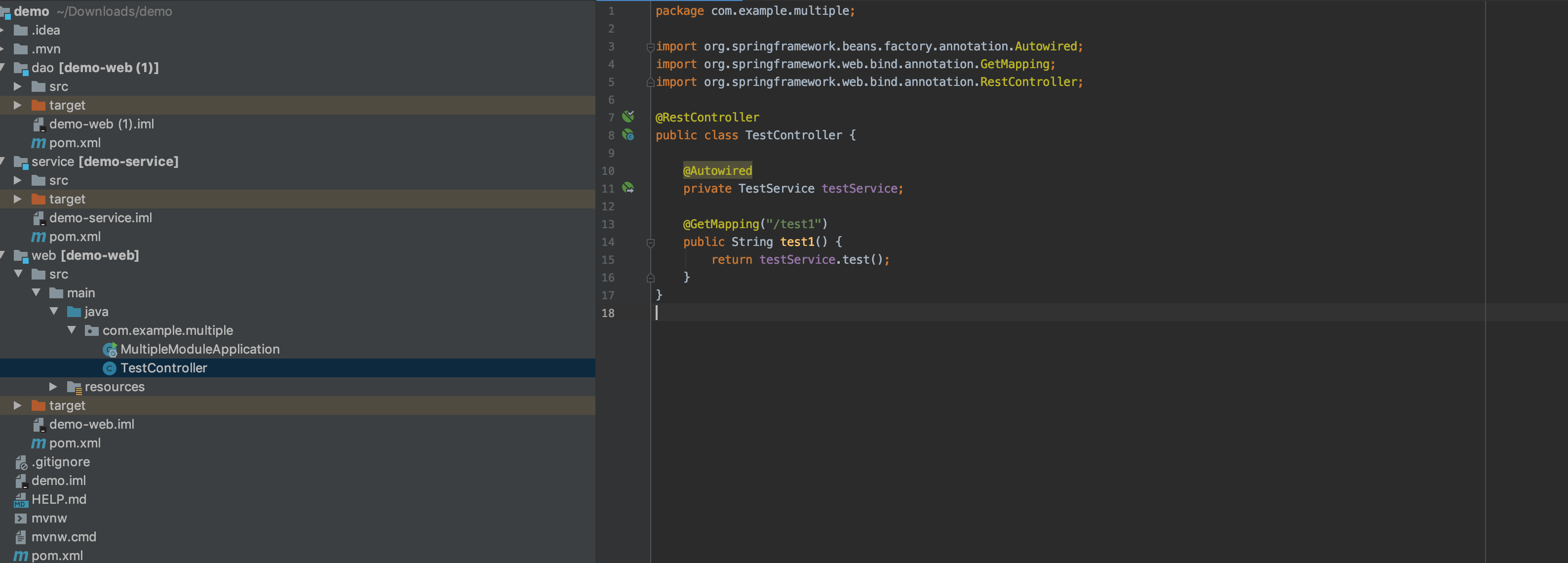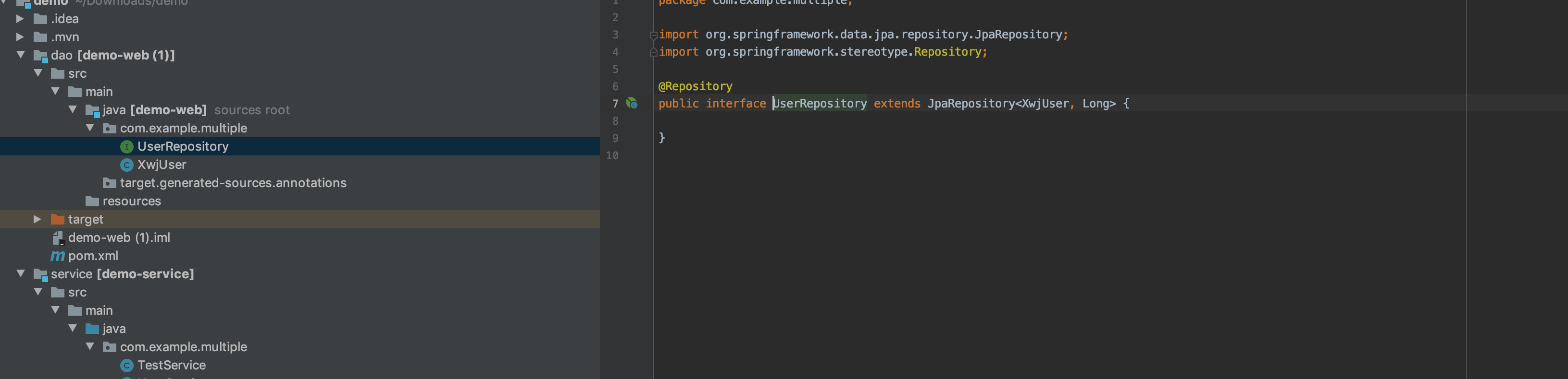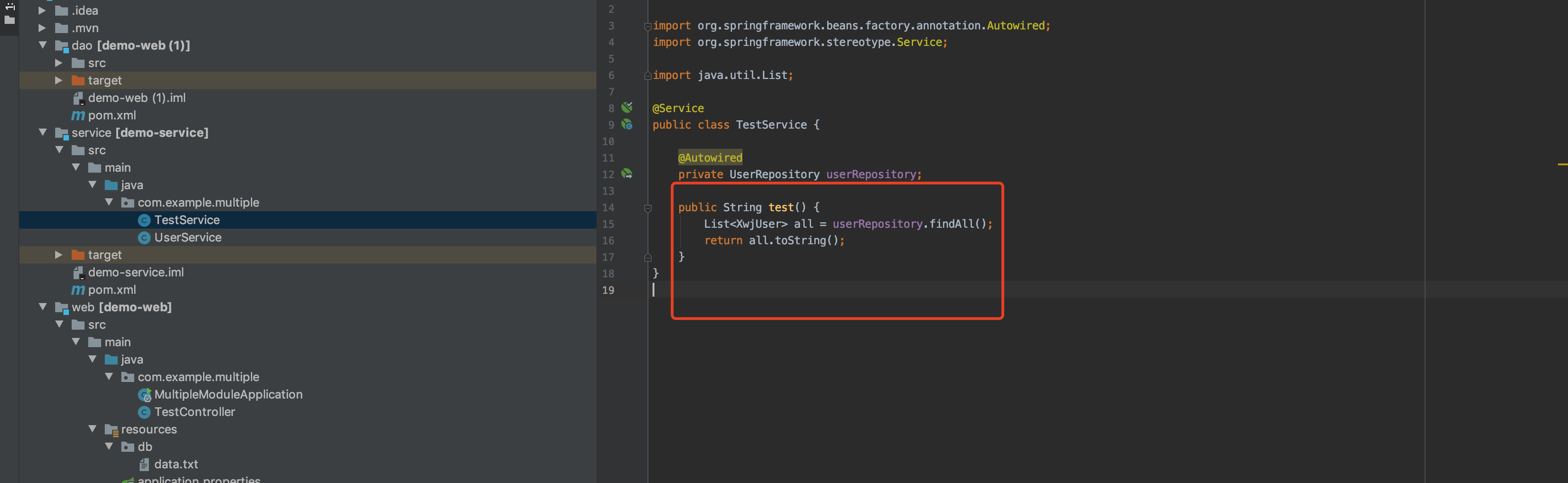 这个地方的TestService是demo-service这个module中的;