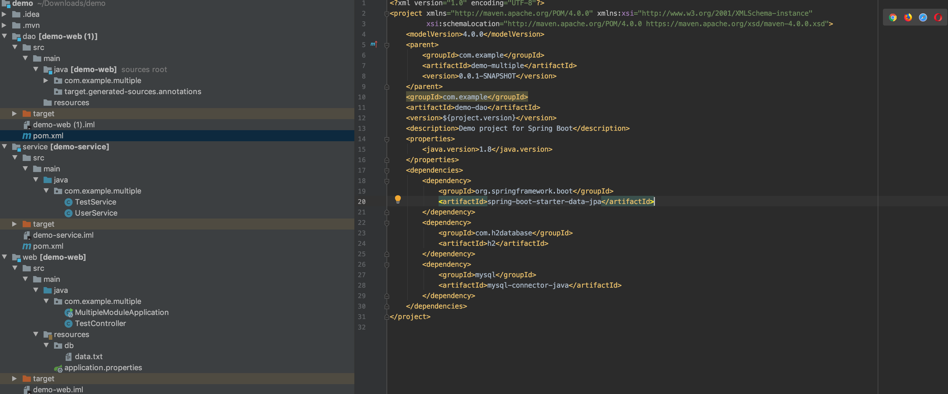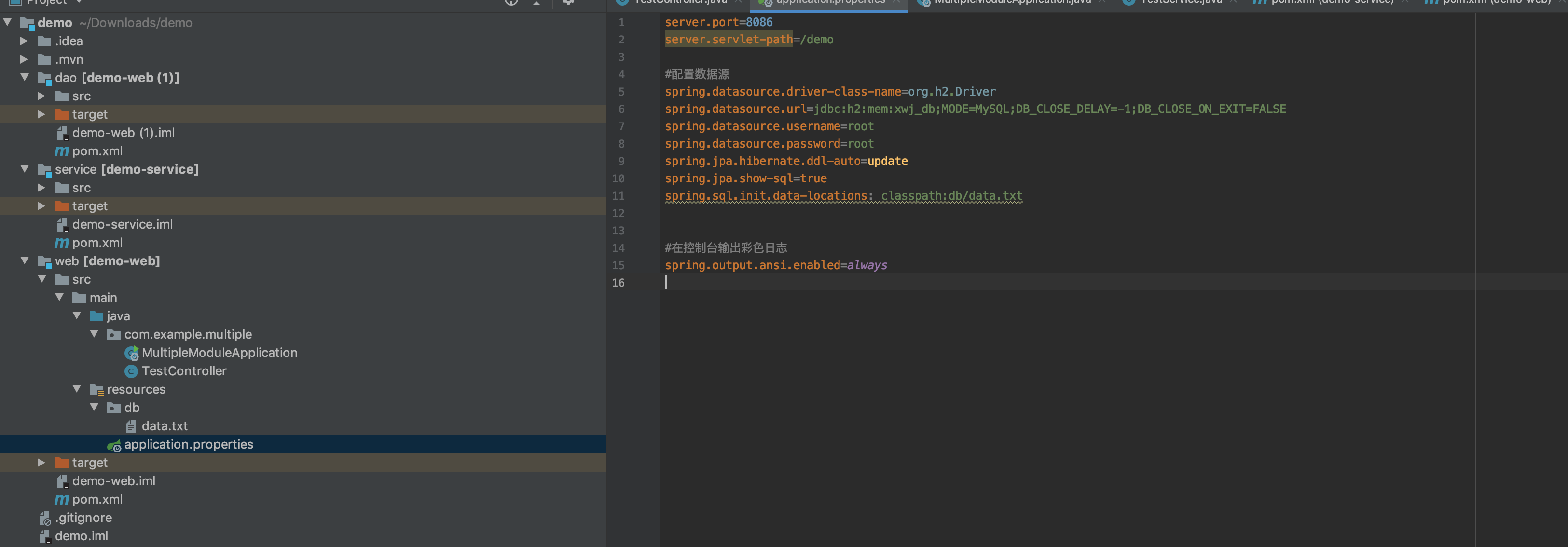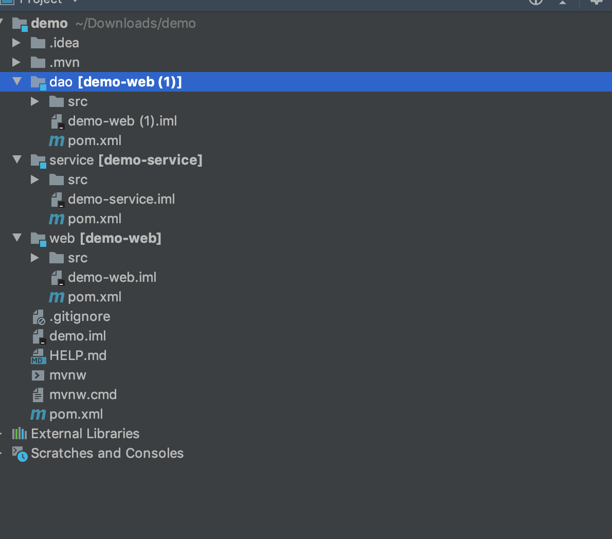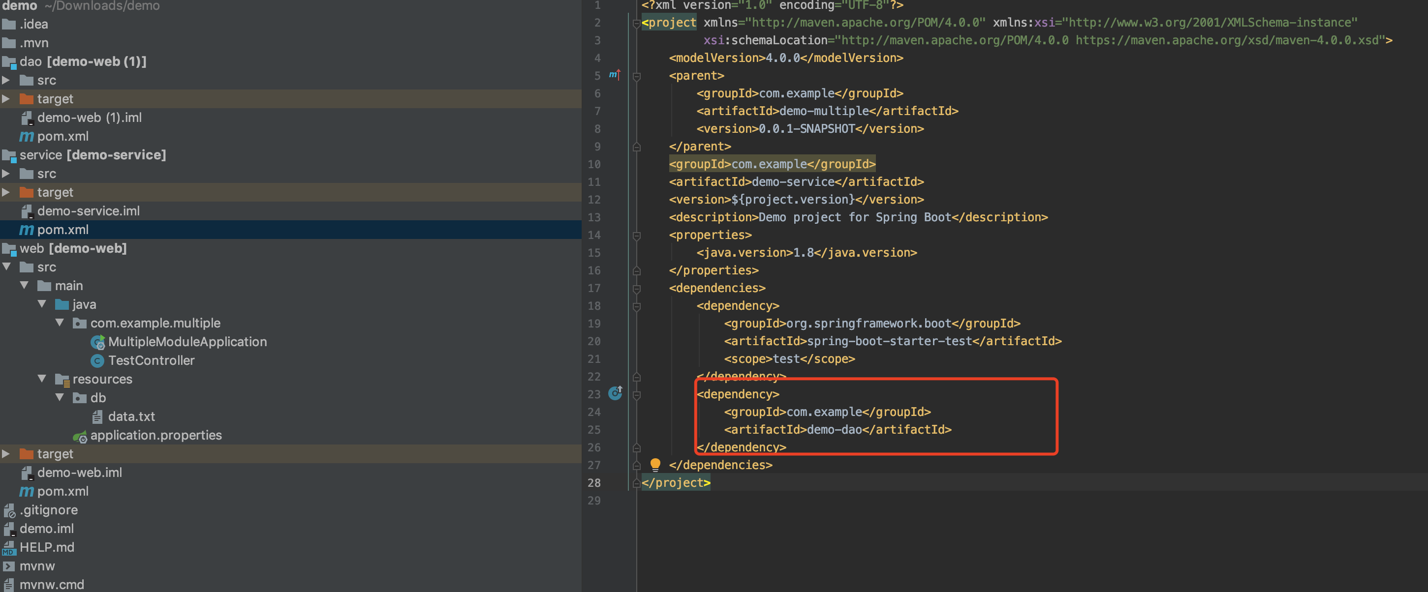 4.0.0 org.springframework.boot spring-boot-starter-parent 2.6.4 com.example demo-multiple 0.0.1-SNAPSHOT pom我们一般定义整个项目的依赖,比如spring-boot-starter-parent;这里同时指定了整个项目有三个模块,分别是web,service,dao;
