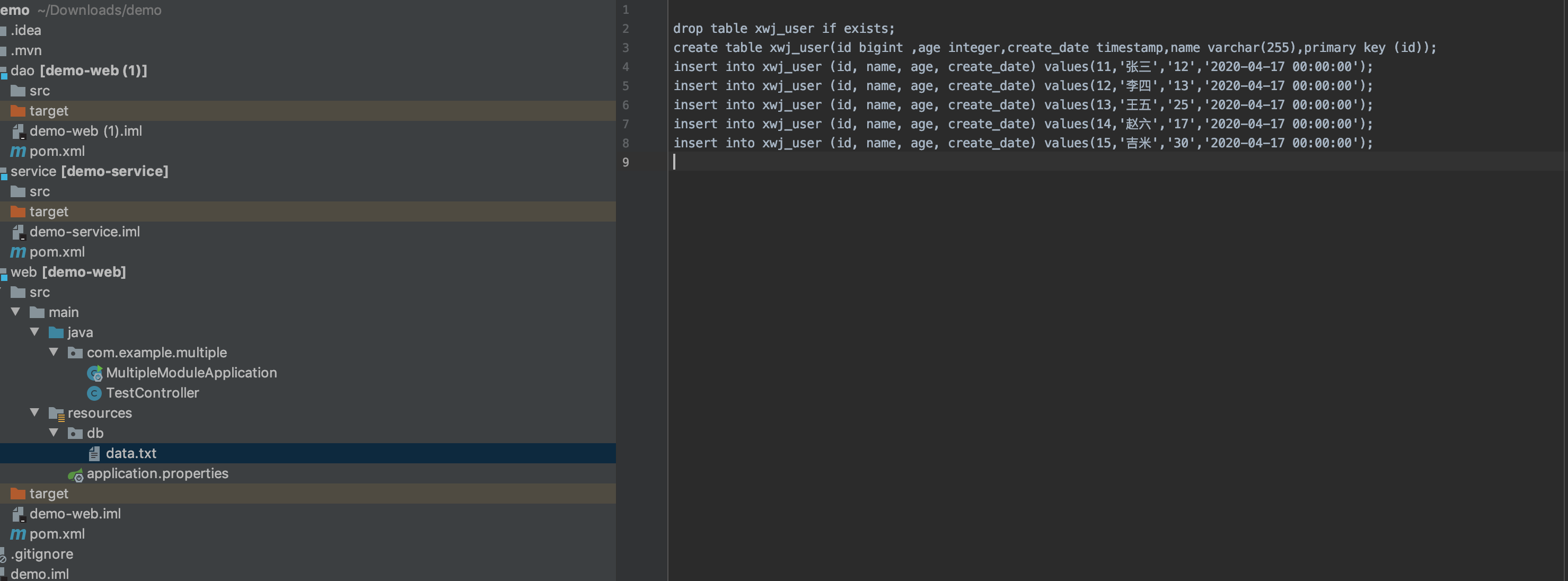 data.txt是数据库的初始化脚本,这里我们用的h2的数据库