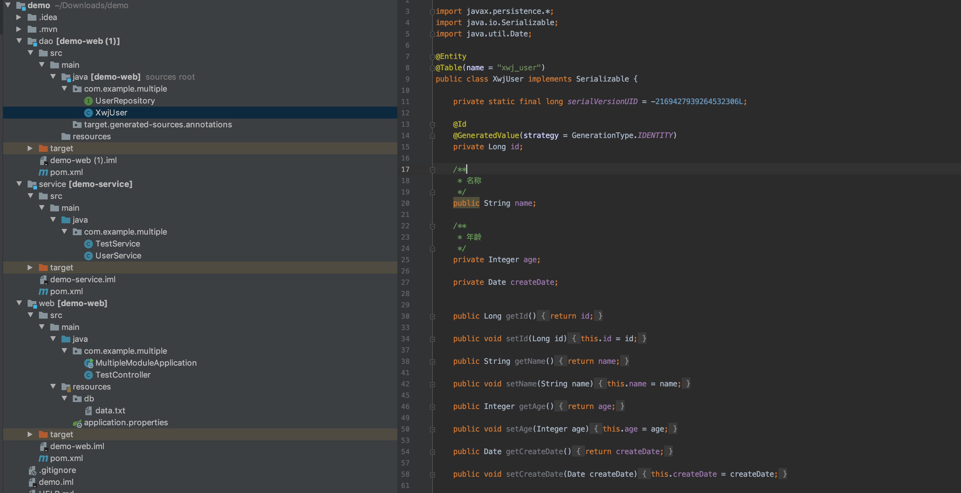 接下来会用一个简单的项目演示,将springboot的web层,service层,dao层拆分成不同的模块;通过一个简单的crud来测试下;