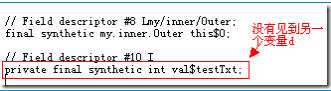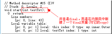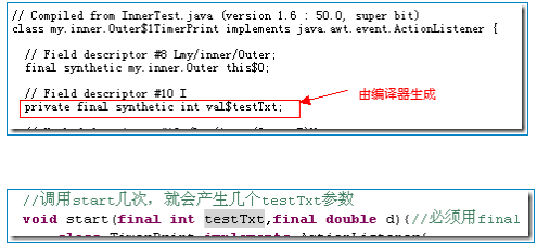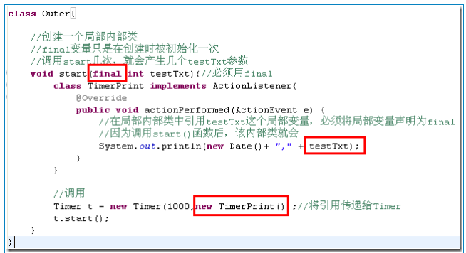 如例中所示,在外部类Outer中声明了一个内部类TimerPrint,这个类中的方法引用了方法start中的一个局部变量testTxt