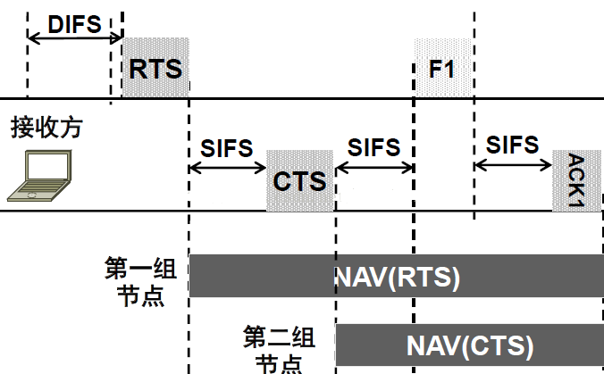 当其他STA收到CTS时,将延后数据包的发送。而具体延迟多久,由正在传输的MAC头中的持续时间决定(Duration ID)。