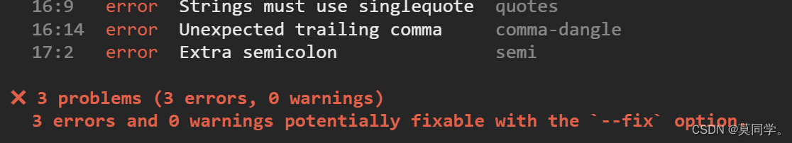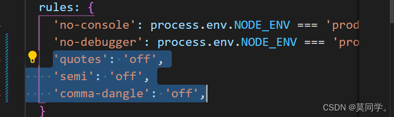 报错: 格式化代码后eslint报错解决方法在配置文件eslintrc.js中添加以下3项 版权声明:本文为weixin_43561427原创文章,遵循CC 4.0 BY-SA版权协议,转载请附上原文出处链接和本声明。原文链接:https://blog.csdn.net/weixin_43561427/article/details/124712314
