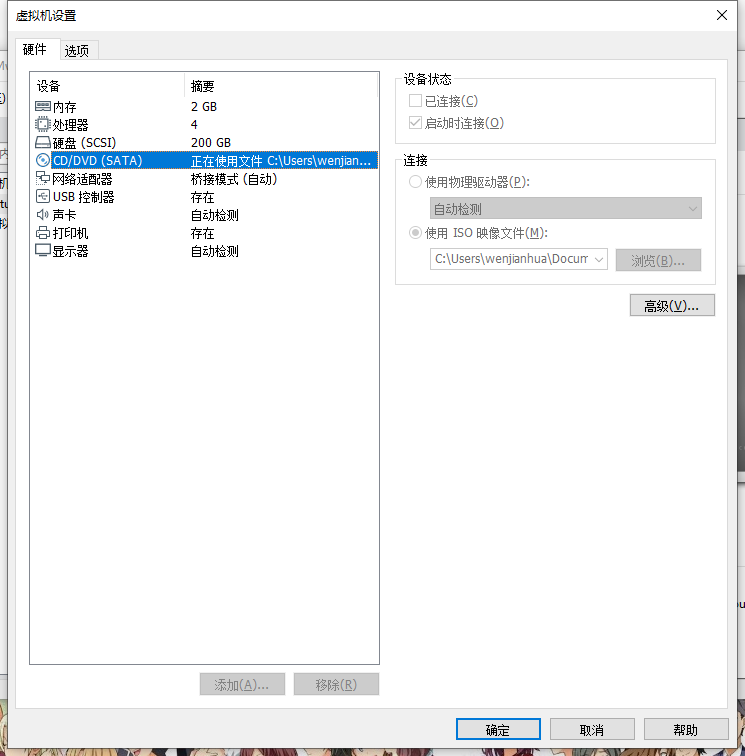 选择连接的第二个iso文件....,(笔者已经弄好的),点击浏览找到之前在官网下载好的centos镜像文件: