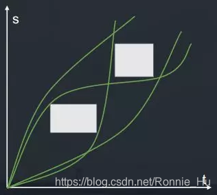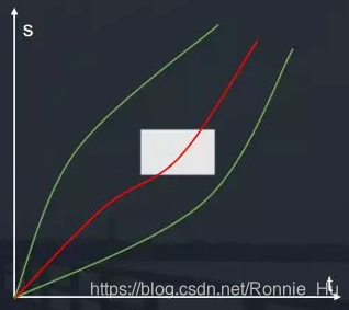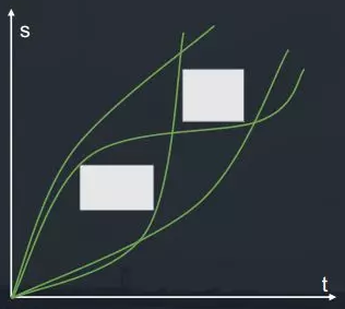 再看速度规划,当一个行人穿马路时,如图中白色矩形所示,对于这种场景,要么加速通过,如图中上方白线,要么减速避让行人,如图中下方白线,很明显,这也不是一个凸问题。