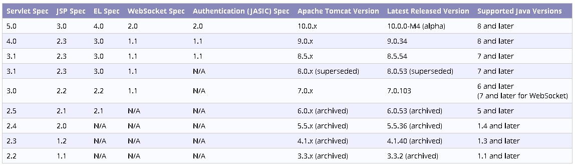 对于第一个问题,可以通过官网的这张图最后一列得到答案(下载的Tomcat的RUNNING.txt和RELEASE-NOTES也有当前版本所需JDK说明):