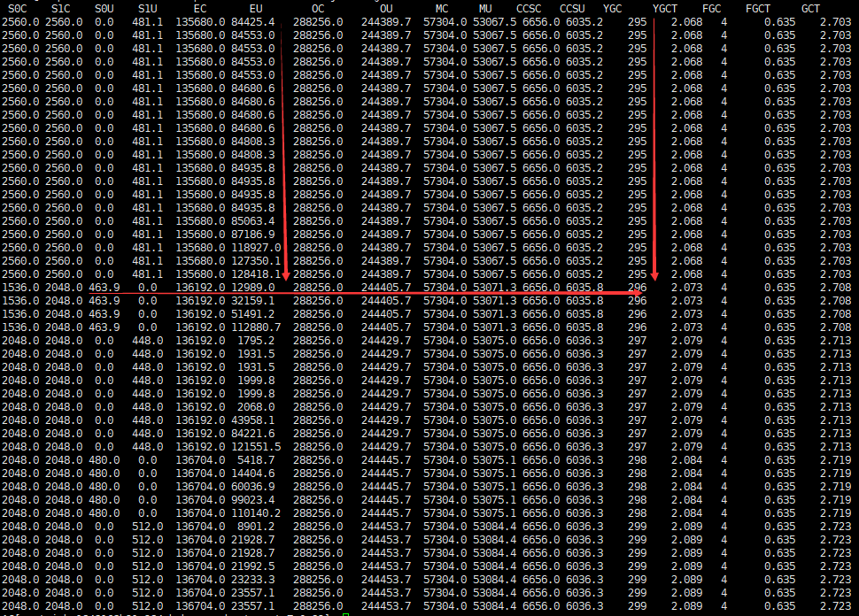 了解了每一列数据的具体含义,继续观察上图数据的变化,因为所有的对象创建之初都会首先在新生代伊甸区申请内存,可以看到刚开始的时候EU=84425.4,随着时间的推移EU数据逐渐增大,当EU增加到128418.1,这时伊甸区的剩余内存=EC-EU=7773.9,这时如果新申请的内存大于剩余内存,就会触发GC,可以从图中看到以下几个数据变化: