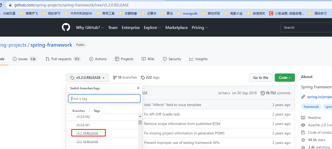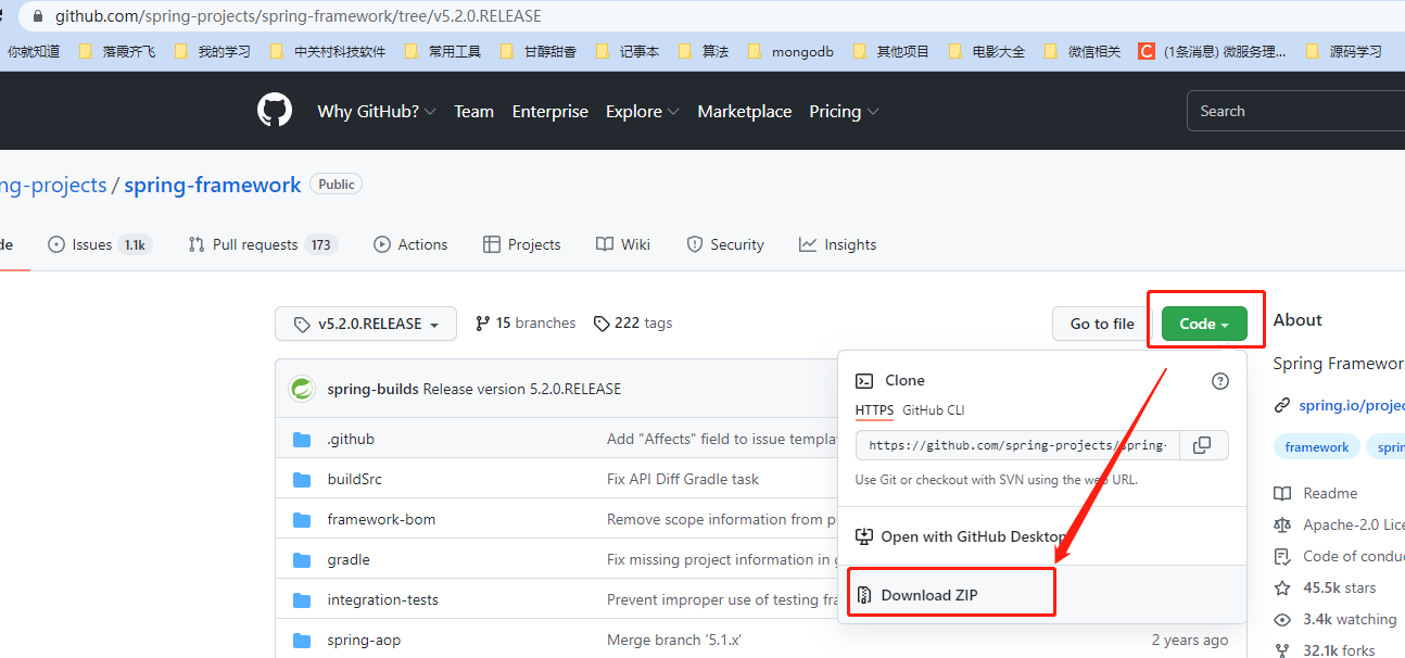 因为我们不需要对源码进行代码提交操作,所以只需要下载zip包就可以了。最好下载RELEASEB版本(spring-framework-5.2.0.RELEASE亲测可用)。