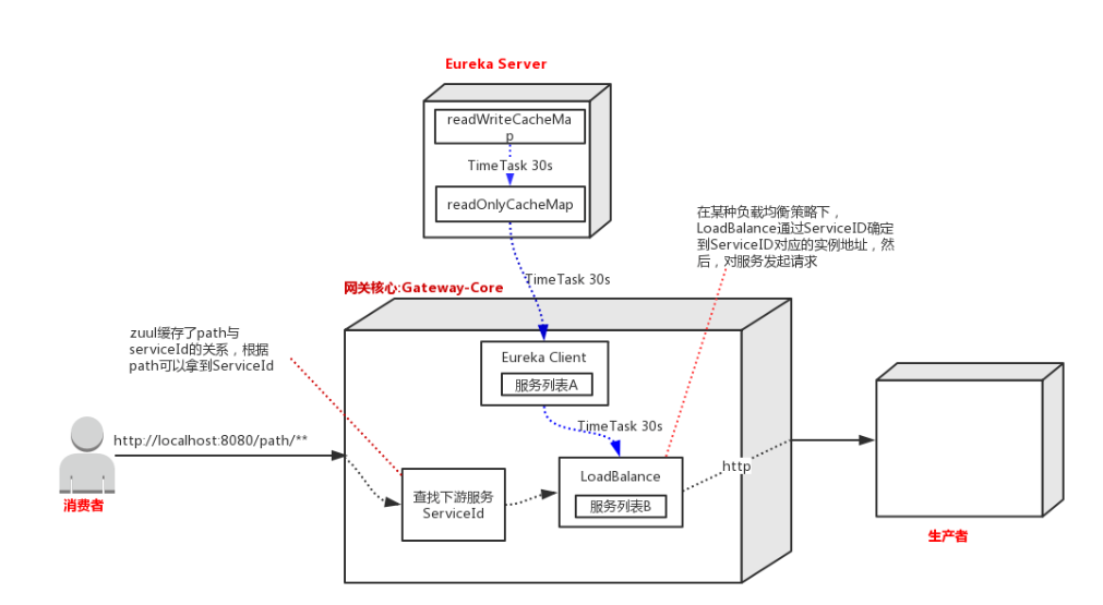 Eureka Server 为注册中心,Zuul 相对于 Eureka Server 来说是 Eureka Client,Zuul 会把 Eureka Server 端服务列表缓存到本地,并以定时任务的形式更新服务列表,同时 Zuul 通过本地列表发现其它服务,使用 Ribbon 实现客户端负载均衡。