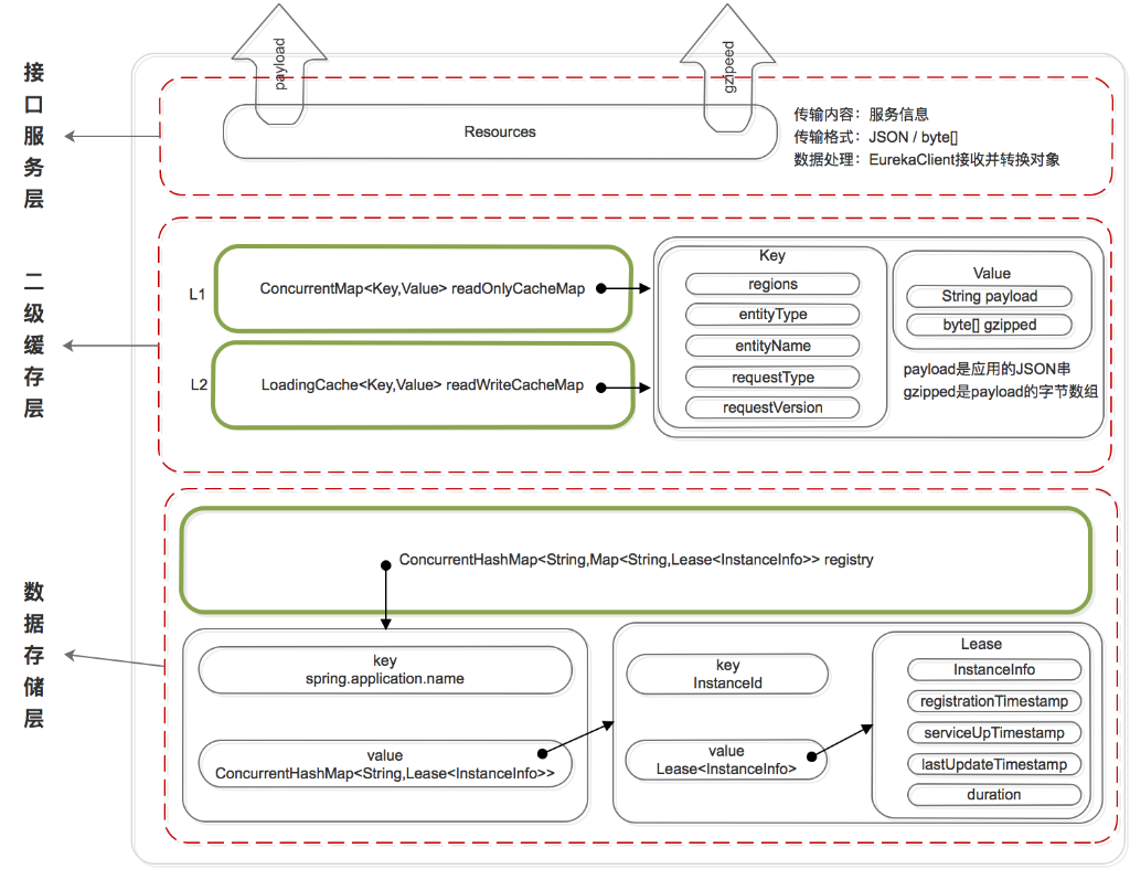 spring.application.name,value 是第二层 ConcurrentHashMap;第二层 ConcurrentHashMap 的 key 是服务的 InstanceId,value 是 Lease 对象;