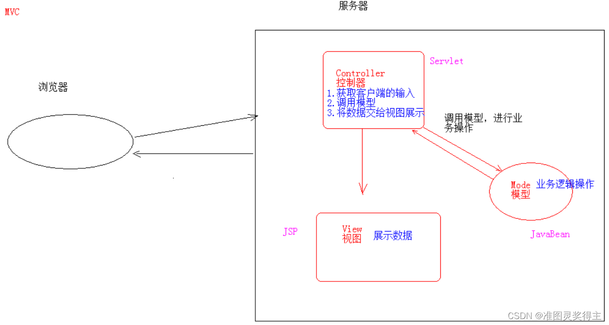 1. jsp演变历史 1. 早期只有servlet,只能使用response输出标签数据,非常麻烦 2. 后来有了jsp,简化了Servlet的开发,如果过度使用jsp,在jsp中 即写大量的java代码,又写html表,造成难于维护,难于分工协作 3. 再后来,java的web开发,借鉴mvc开发模式,使得程序的设计更加合理性 2. MVC——将程序分为Model、View、Controller三部分 1. M:Model,模型。JavaBean(Java对象) 完成具体的业务操作,如:查询数据库,封装对象 2. V:View,视图。JSP 展示数据 3. C:Controller,控制器。Servlet 1.获取用户的输入 2.调用模型 3.将数据交给视图进行展示