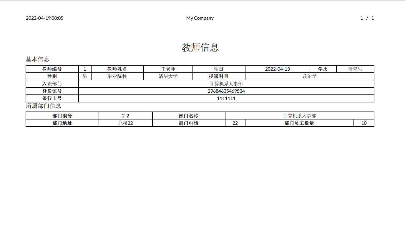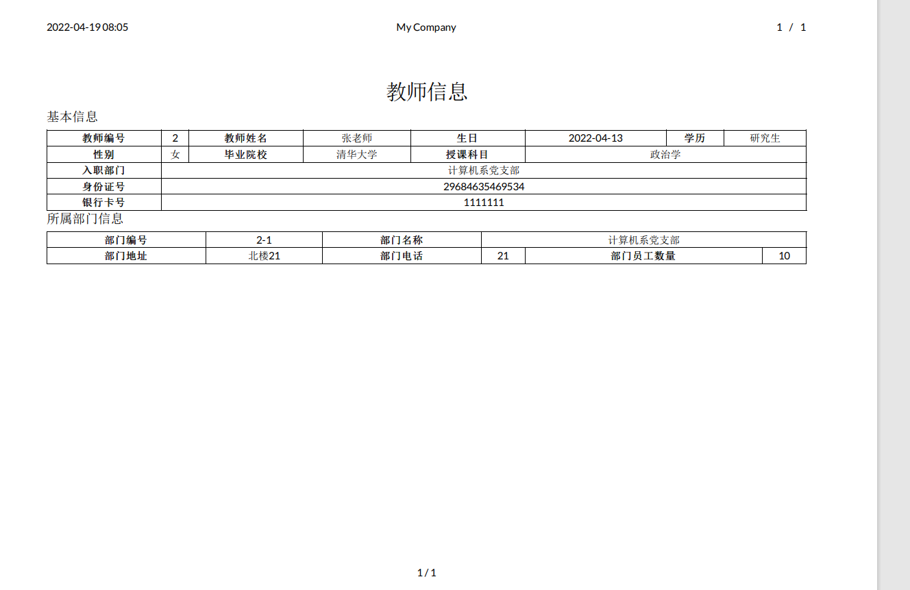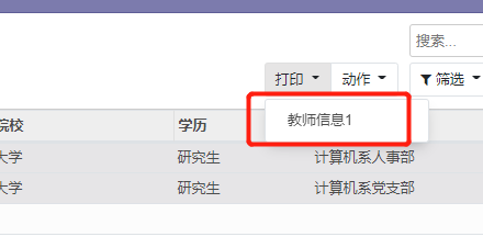 <?xml version="1.0" encoding="UTF-8" ?> <odoo> <data> <!--纸张格式定义--> <record id="teacher_info_report_paper" model="report.paperformat"> <field name="name">教师信息纸张定义</field> <field name="default" eval="True"/> <field name="format">A4</field> <!--横向打印--> <field name="orientation">Landscape</field> <!--纵向打印--> <!--<field name="orientation">Portrait</field>--> <field name="margin_top">30</field> <field name="margin_bottom">20</field> <field name="margin_left">20</field> <field name="margin_right">20</field> <field name="header_line" eval="False"/> <field name="header_spacing">20</field> <field name="dpi">90</field> </record> </data> </odoo>5.最终结果