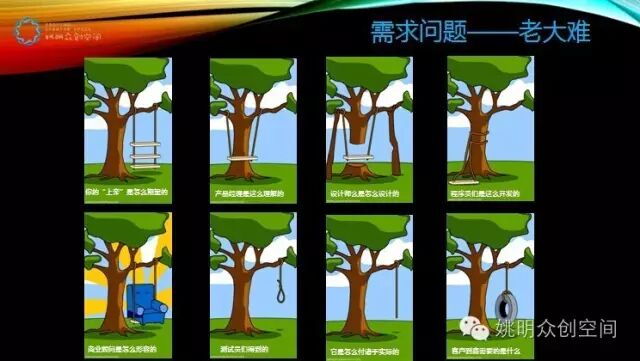 为什么我们要来用领域驱动这个概念来做开发呢?这张图大家很熟,最初用户可能是要做这样的东西,做这样的秋千,而产品经理理解是这样的,而到了设计师是理解层这样,而程序员做成这样的,而外部的商业部门宣传是这样子,而我们测试人员拿到的是这个样子,最后实施的是这个样子,到客户的手里是这个样子的。这就是典型的需求问题。为什么会造成这样的问题,其中很重要的一个原因就是沟通不到位。