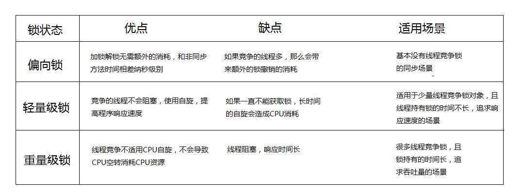从上图可以看出,对于对象锁可能存在的4中状态:无锁->偏向锁->轻量级锁->重量级锁,并且其中锁的升级是不可逆的。