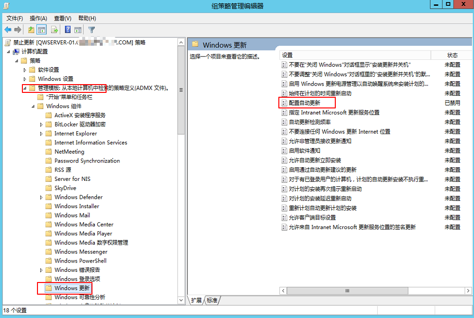 3、在组策略管理编辑器中:计算机配置-管理模板-windows更新-配置自动更新