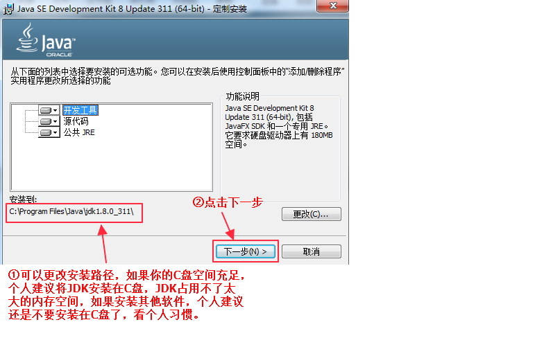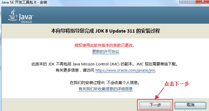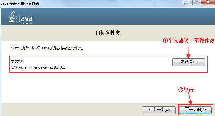 等进度条完成后,会提示安装jre,当然jre也是可以修改安装路径的,这个jre的安装路径个人建议和上面的jdk放在一起,毕竟一家人要整整齐齐。(本人这里就不做更改,直接下一步了。)