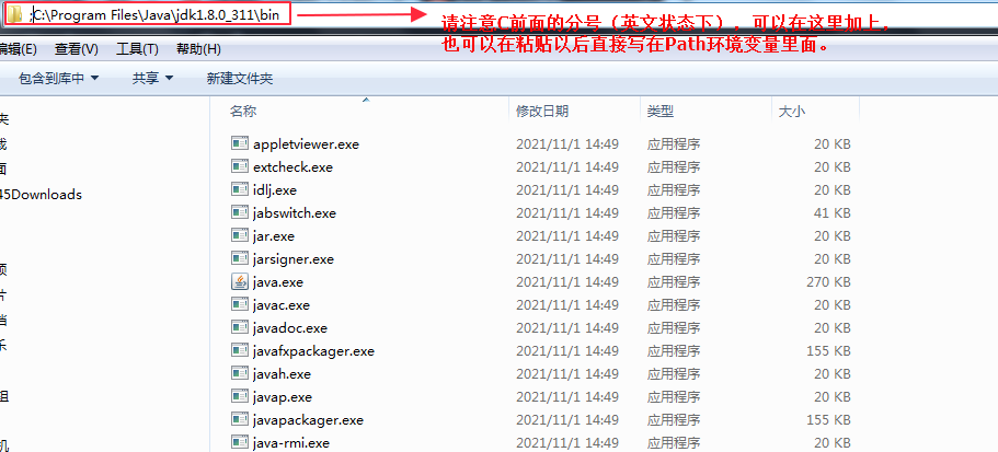 还需要再进行最后一步,将上面的bin目录的路径添加到 Path环境变量里面,和上面一样,双击bin文件夹,进入文件夹,复制粘贴,需要注意的是,Windows7的Path环境变量使用英文的分号(;)分隔
