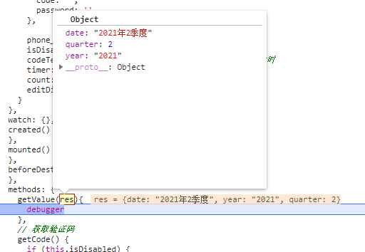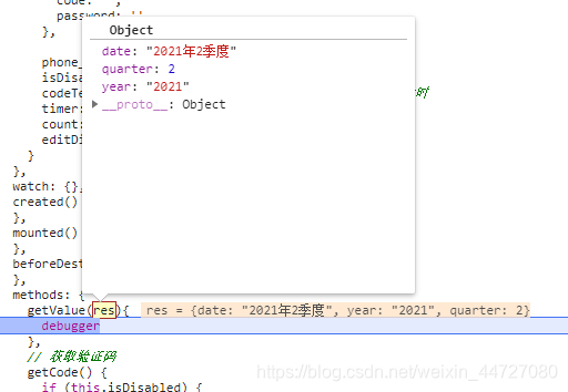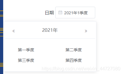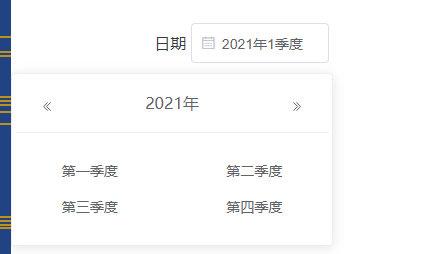 defaultVal: '2021-03',3、拿到我们当前季度框显示的值信息