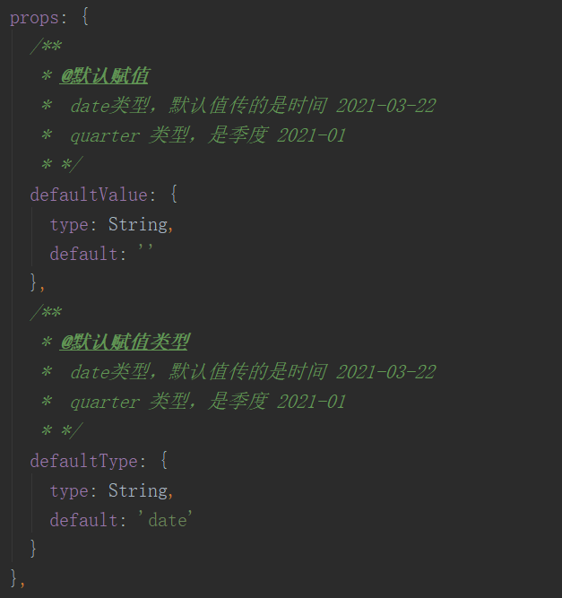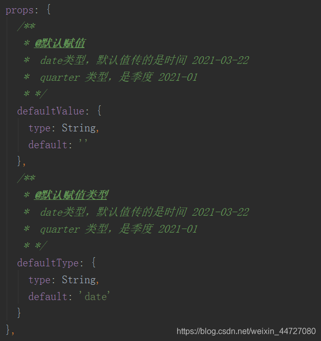 1、prop里支持两个内容,分别是一个默认值(当前日期,或者当前季度两种),还有一个默认值的类型