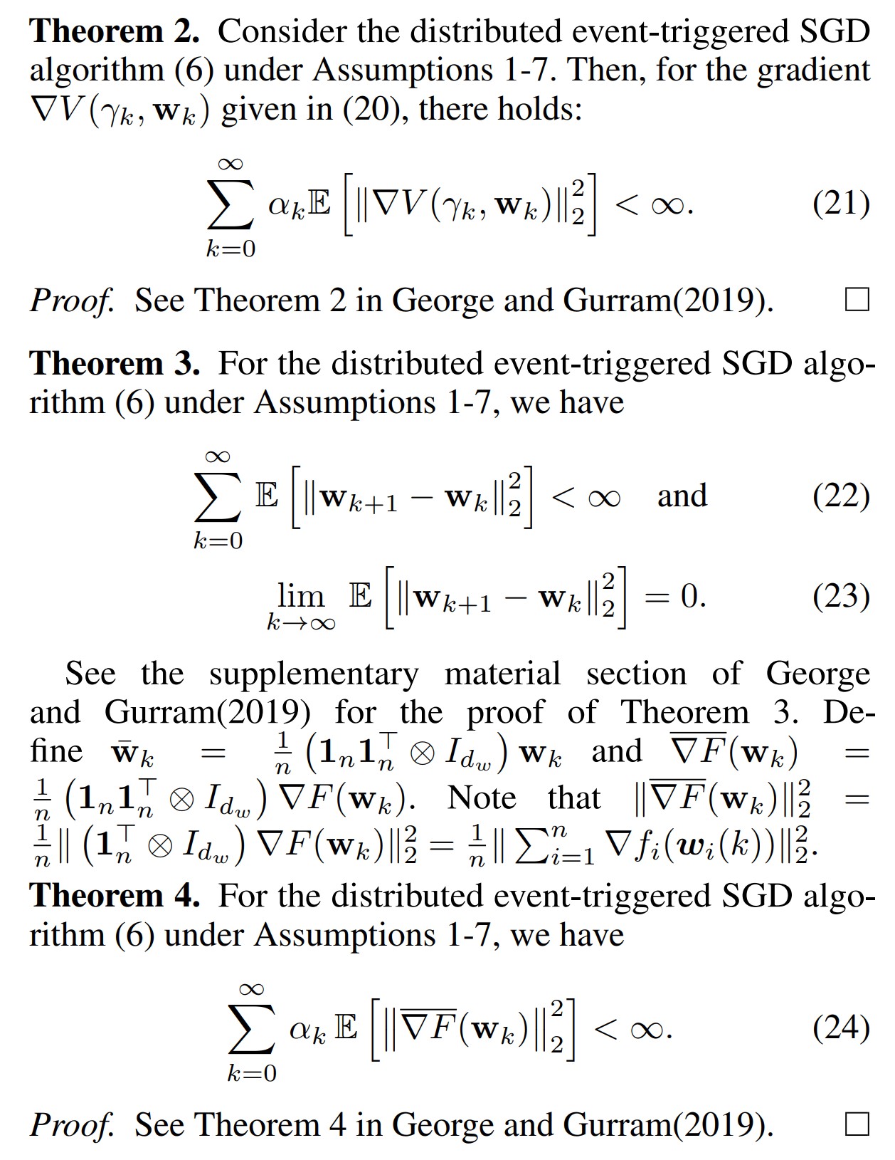 (seeTheorem 1). Asymptotic convergence of the algorithm is then proved in Theorem 3. Theorem 4 then establishes that the weighted expected average gradient norm is a summable sequence. Convergence rate of the algorithm in the typical weak sense is given in Theorem 5. Finally, Theorem 6 proves the asymptotic mean-square convergence of the algorithm to a critical point. Theorem 1. Consider the event-triggered SGD algorithm (6) under Assumptions 1-7. Then, there holds: