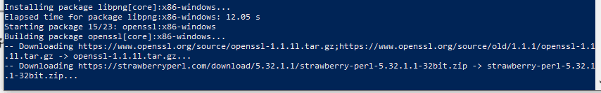 在下载的过程中可能会卡在下载openssl这一步,可以把https://....zip这一段网址复制粘贴到浏览器中,自行下载,下载完毕后将zip粘贴到src/vcpkg/downloads中,然后重新在powerShell中运行命令行:.\vcpkg\vcpkg install gdal即可;我也将这个下载好的zip文件放到百度云中,有需要的兄弟可以自行获取,就不用自己下载了噢!