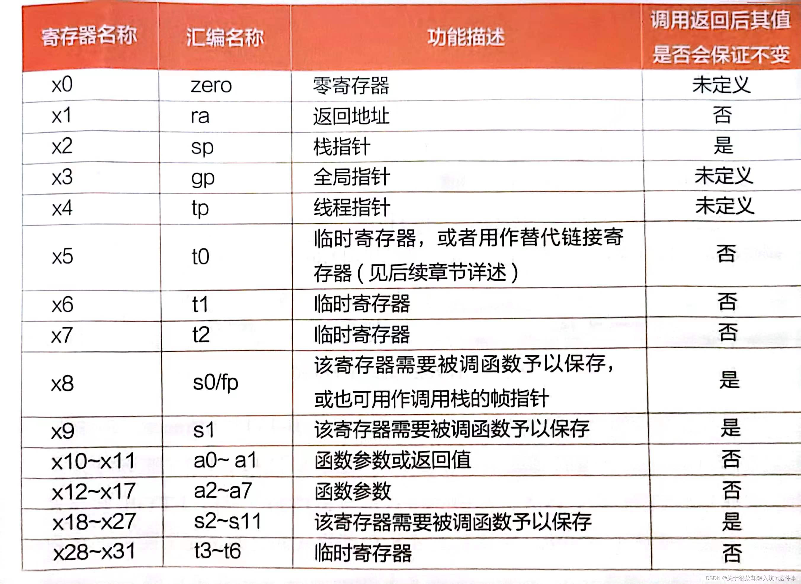 32个寄存器分别被标记为x0~x31 ,其中零号寄存器是制度寄存器。其值一直为0;RISC_V设计目标之一就是对C/C艹等高级语言提供硬件支持,并保持不同处理器之间在ABI层面的相互兼容。关于应用程序二进制接口ABI的介绍可以参考:什么是应用程序二进制接口ABI - 知乎。写得挺好。这里做一下简单总结: