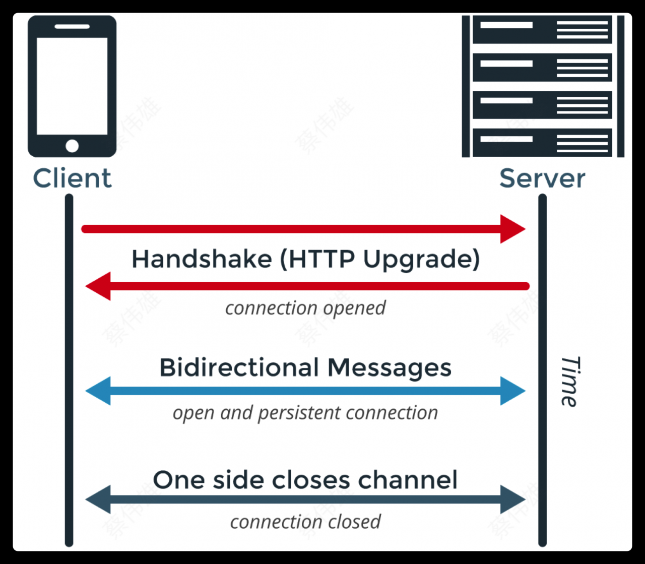 握手从 HTTP 请求/响应开始,允许服务器在同一端口处理 HTTP 连接和 WebSocket 连接。一旦连接建立起来,通信就切换到不符合 HTTP 协议的双向二进制协议。