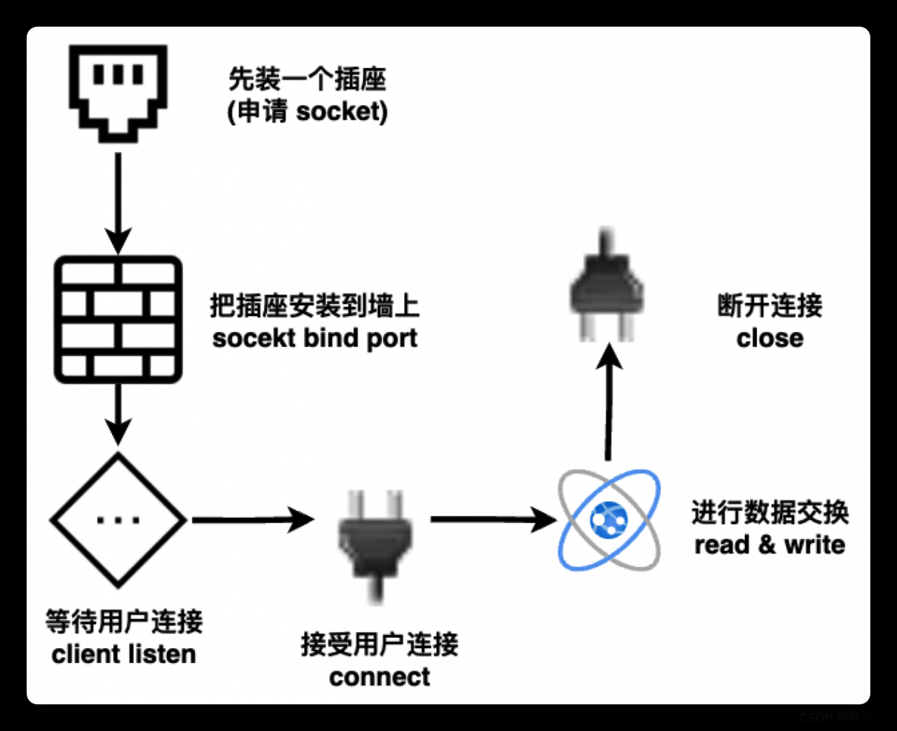 SOCKET 是用来让不同电脑之间,不同进程之间互相通信的一套接口。Socket, 直译过来可以是“插座”,而在中文中往往会叫“套接字”。双方要建立连接, 首先就会申请一个 套接字 来传输消息