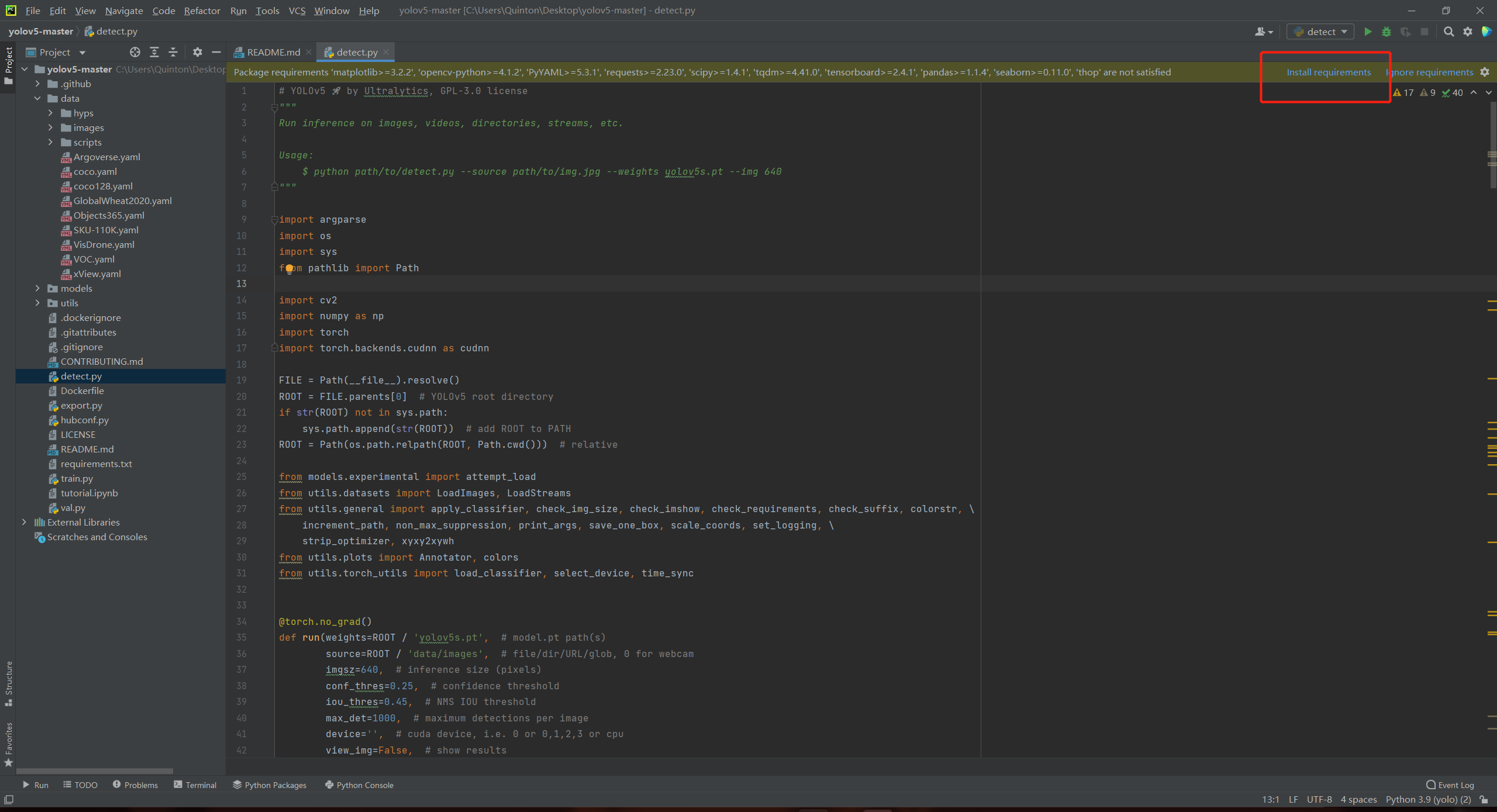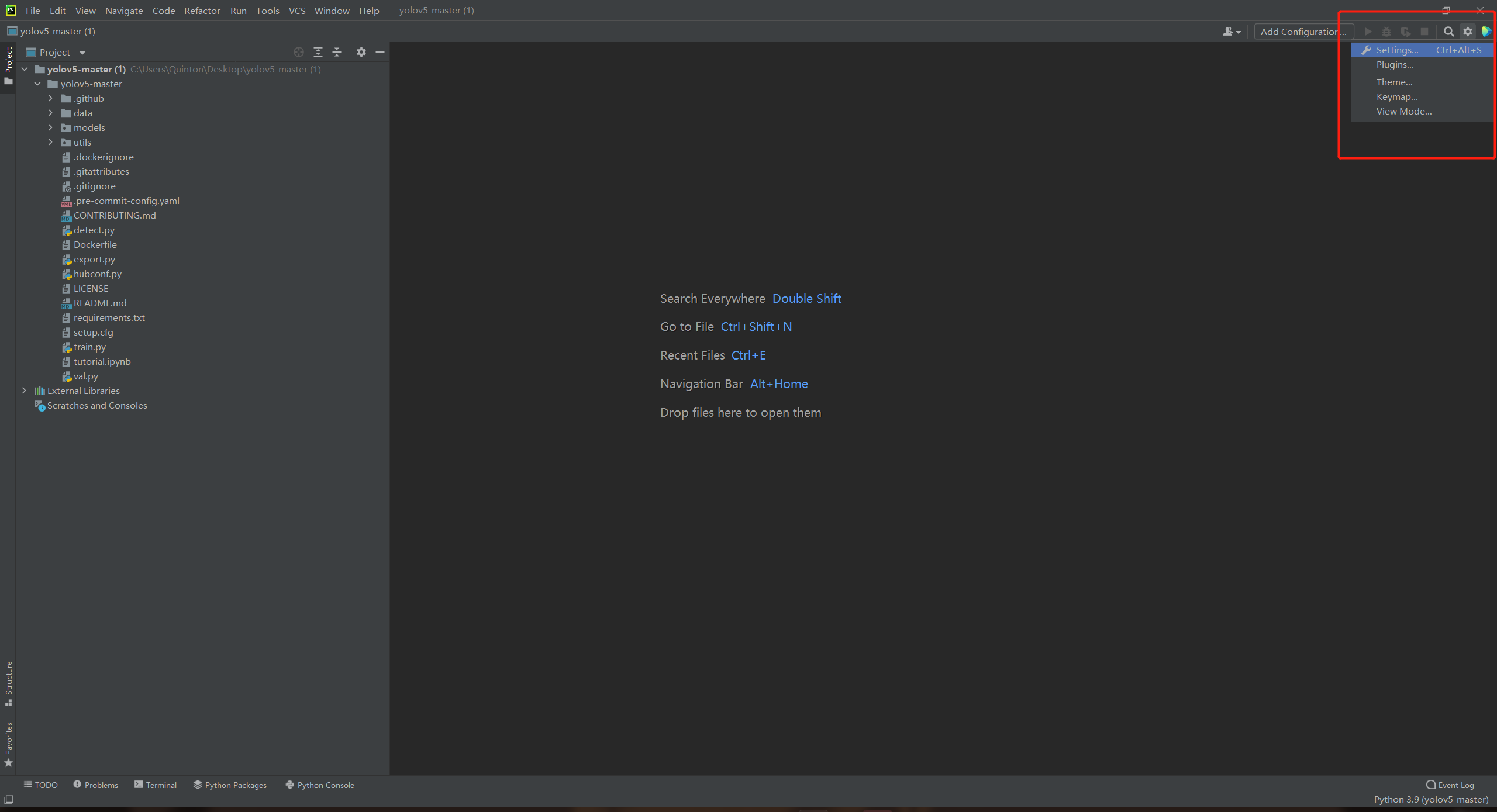 pycharm安装完成后,使用pycharm打开已经下载好的yolov5项目源码