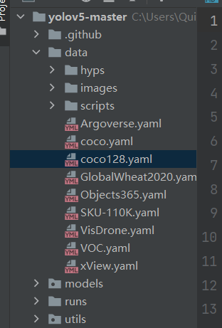 将项目源码自带的coco128.yaml复制进myyamls文件夹