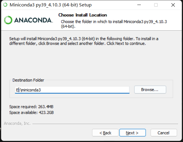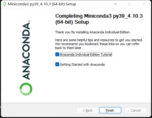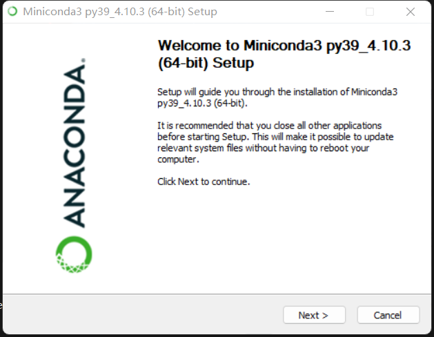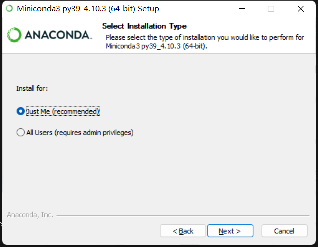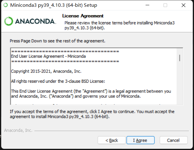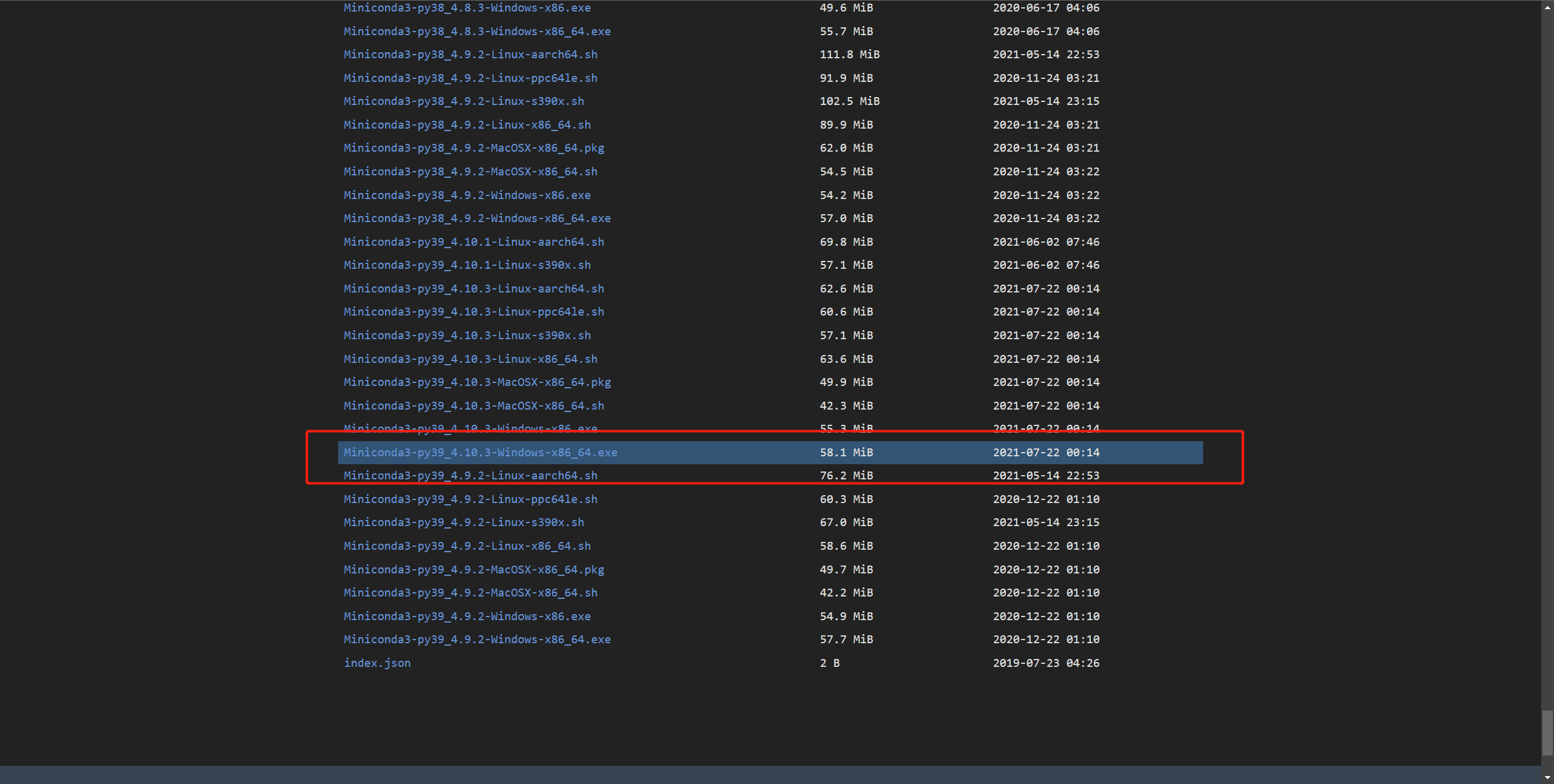 下载好的conda会自带一个版本的python,这里推荐选择3.6~3.8的python,这里下载的是py39