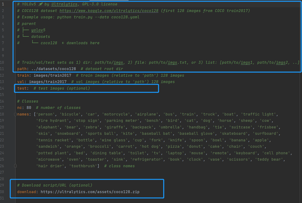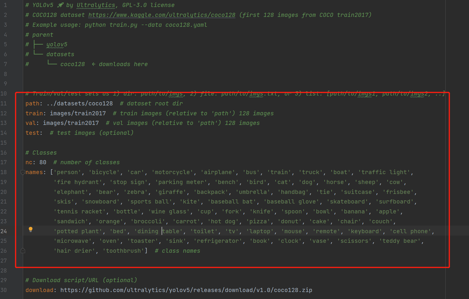 yaml文件是模型训练的重要依据,通过yaml文件确定数据集的位置以及类别