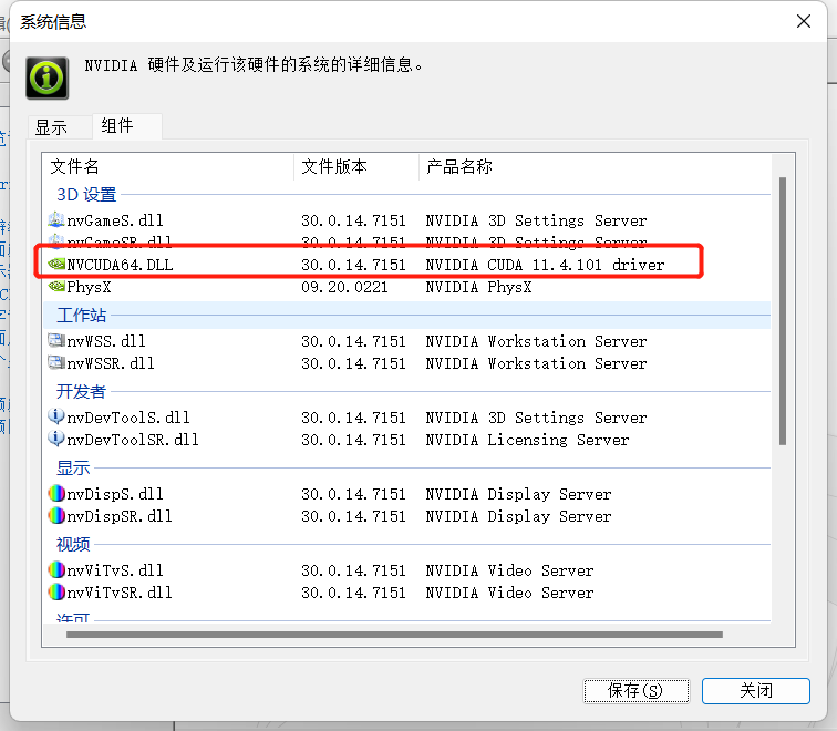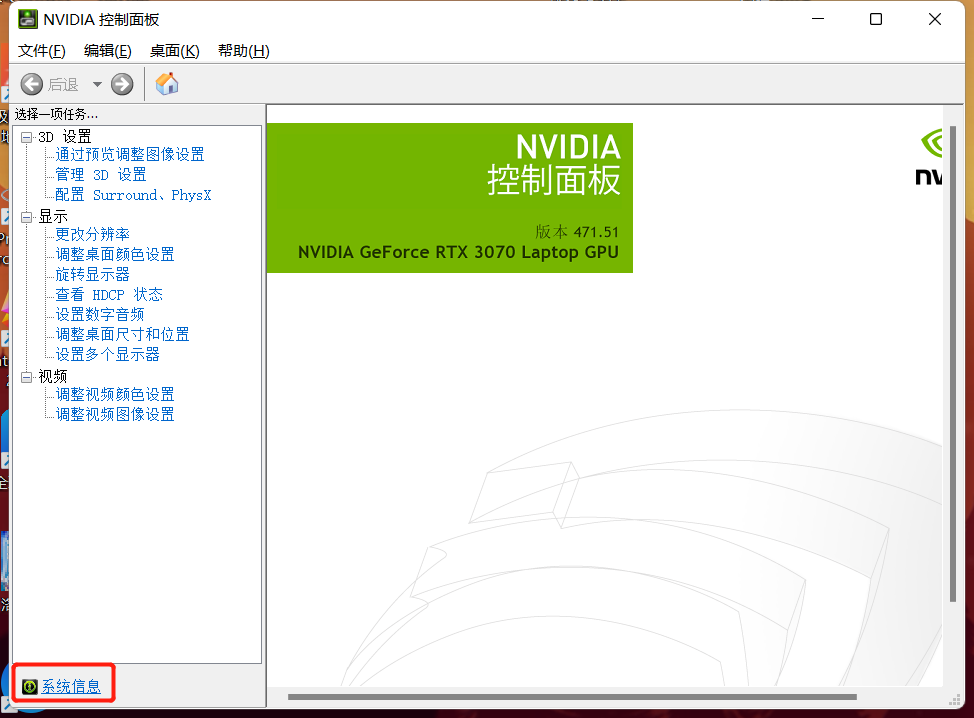 右键桌面->NVIDIA控制面板->系统信息->组件