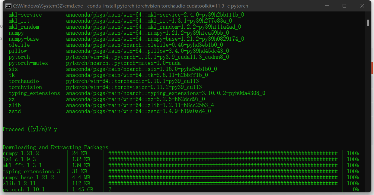 开始安装pytorch,会有一点大,稍微等一下,添加国内源会更快一些