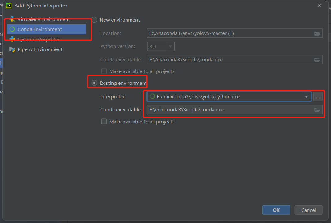 选择添加Conda Environment,点选添加已存在的环境Existing environment