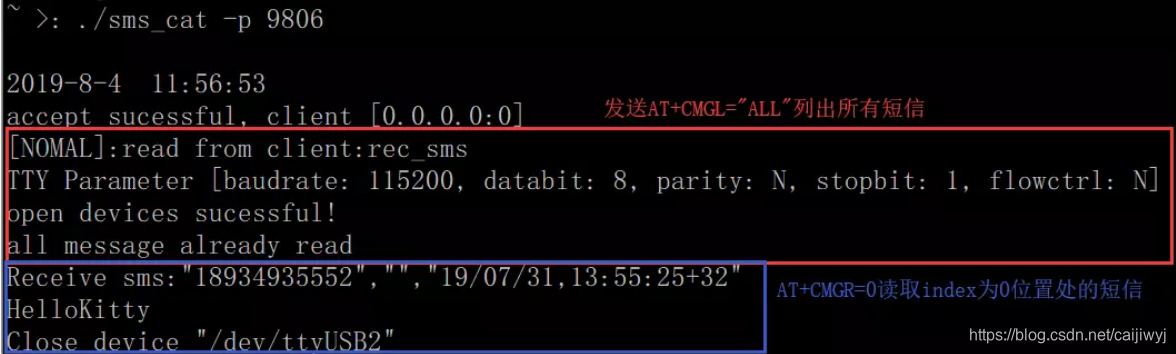1. 服务器端./sms_cat -p ${port} -d