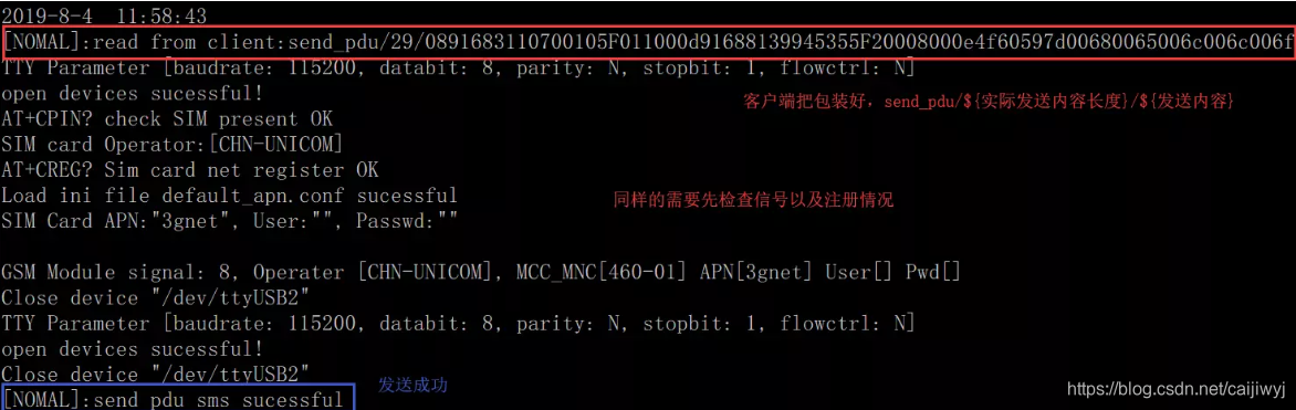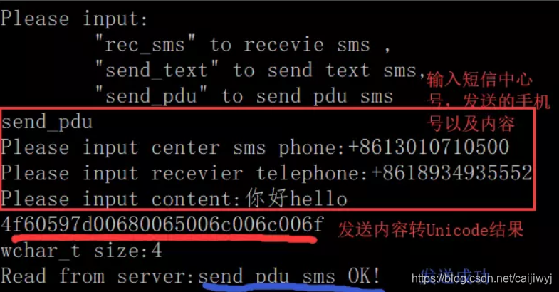 客户端输入“send_pdu”,接着还需要输入短信中心号码,收信对方手机号,还有发送的内容