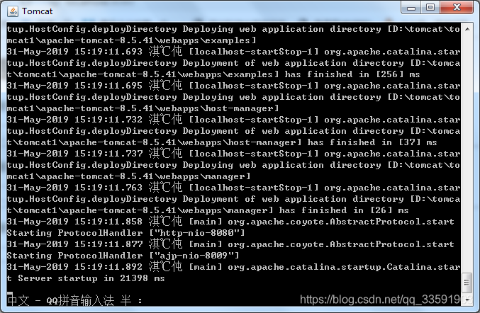 </Host>此时运行Tomcat安装目录下的bin/startup.bat,可以看到项目正常启动了,但启动的控制台界面可能输出乱码,如下图。