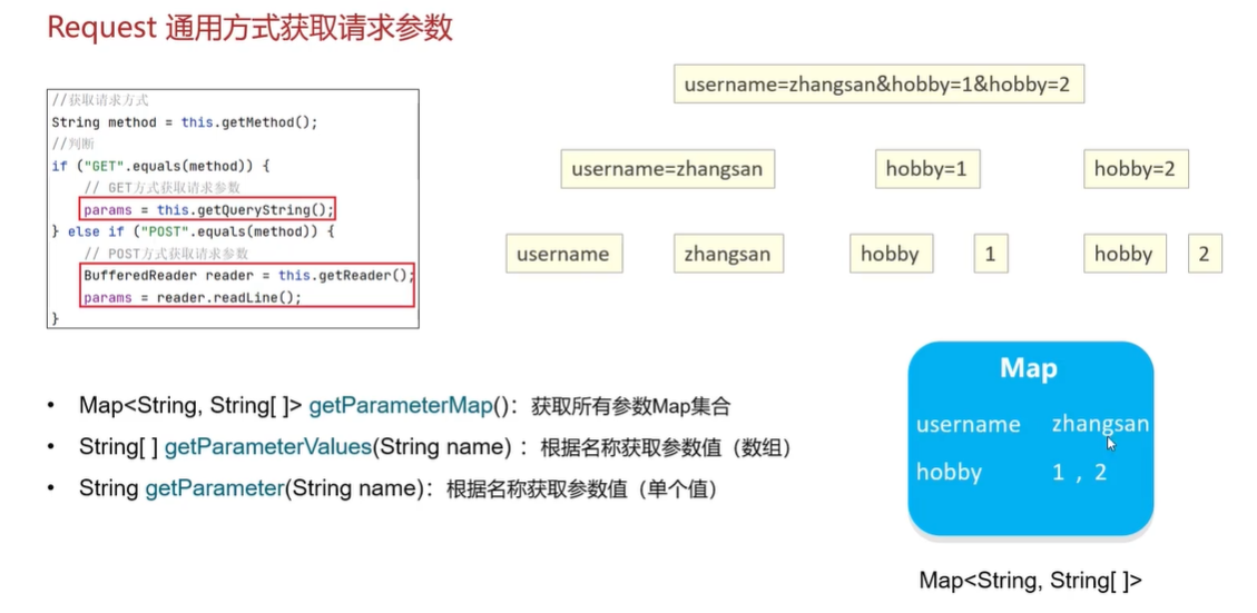 - String getParameter(String name):根据名称获取参数值(单个值)