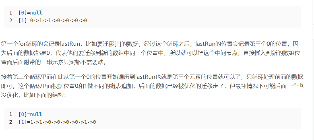 它是指使用lastRun标识,标志那些在后面有一串都是0的结点,因为他们都是留在原位置的 lastRun标记位置开始到末尾,那个新增的数是0;当然扩容是换了一个长度* 2 的新数组进行操作。 直接就可以提到新数组中去。然后剩下的就是直接遍历了,一个一个来。莫得办法。
