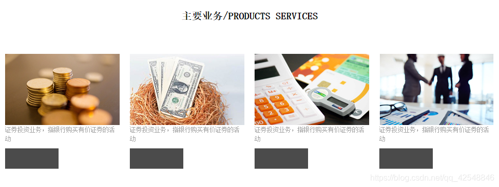 此时,四个盒子并没有在一行并排显示,原因是因为div是块级元素,块级元素独占一行。这时就需要用浮动,让四个div并排显示(即在.service .yw里面加上float:left;)。看一下效果图。