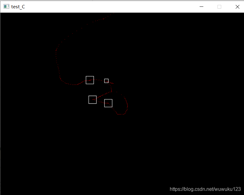 程序运行释义:该程序会用红色的点标出鼠标移动的轨迹,按左键画一个小方块,按Ctrl+左键画一个大方块,按右键退出: