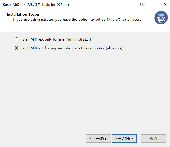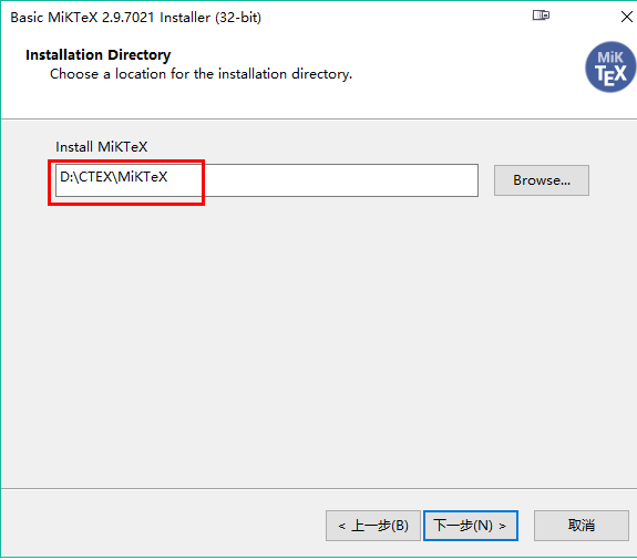 3)双击下载的basic-miktex-2.9.7021.exe,开始安装,安装路径设置D:\CTEX\MiKTeX(盘符根据自己的安装路径决定)