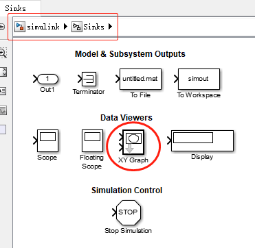 在simulink库模型中打开Sinks子系统,找到XY Graph模块,