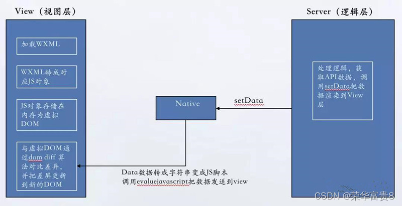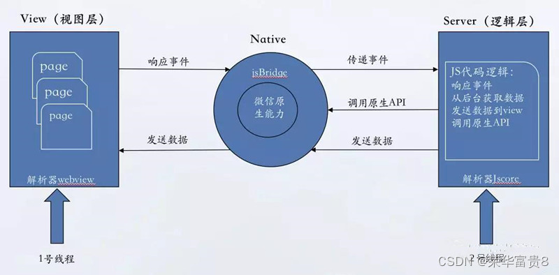 了解整个原理有助于编写高效的代码,先上总预览图:微信加载完小程序后会启动两个线程来分别跑视图层和逻辑层代码,等于两个代码分处于不同的容器。那就涉及到这两个容器之间的数据通信和交互,目前view层到Server层传递方式为”响应事件”,server层到view层则是”setData”数据。Server层的解析器为jscore, view层的解析器为webview。
