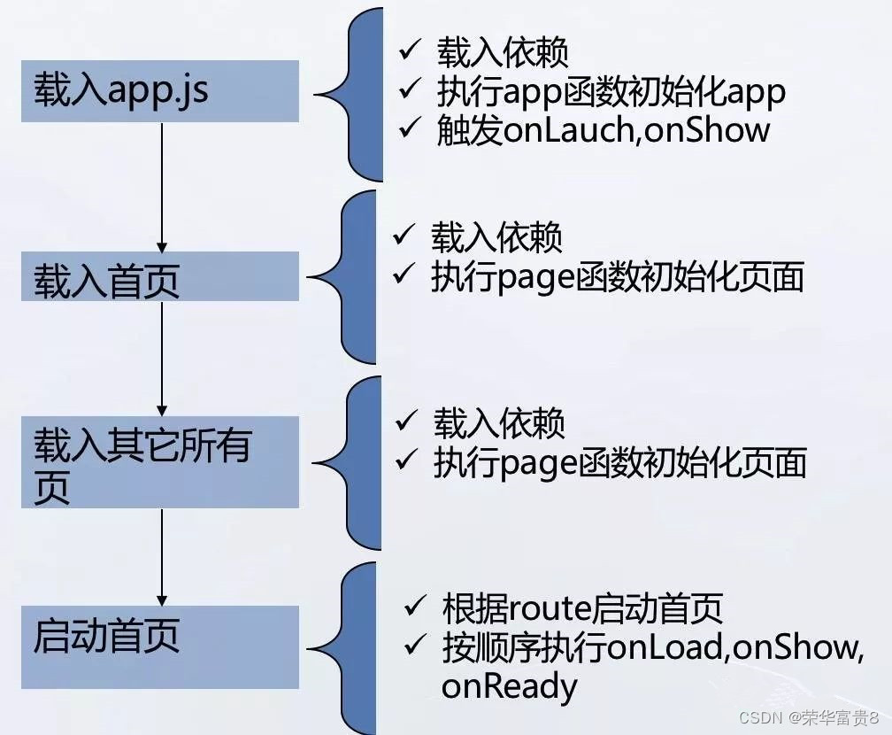 - js为入口文件,每个页面都会经过该页,其onLauch触发条件为第一次冷启动后执行一次,onShow的触发条件为点击退出小程序按钮,然后在没有被回收时,又从任务栏呼起小程序时。由上图知道每个小程序的所有页面都会在第一次启动时全部加载。