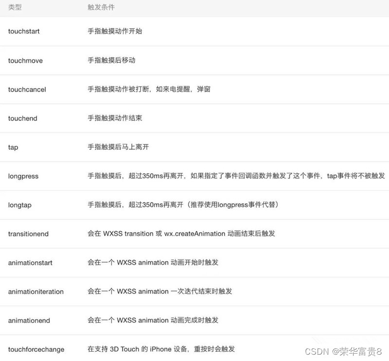 目前在界面上绑定一个事件由bind + 事件类型或 catch+事件类型,bind的方式绑定事件不会阻止事件冒泡,catch的方式绑定会阻止事件冒泡。事件类型如下: