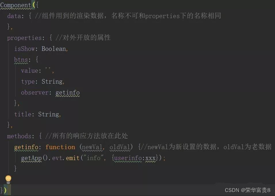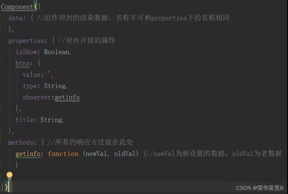组件里的properties是对外开放的属性,每个属性有三个字段来标明:type表示属性类型,value 表示属性初始值、 observer 表示属性值被更改时的响应函数。