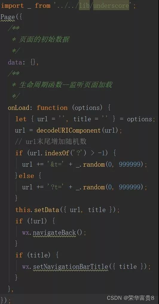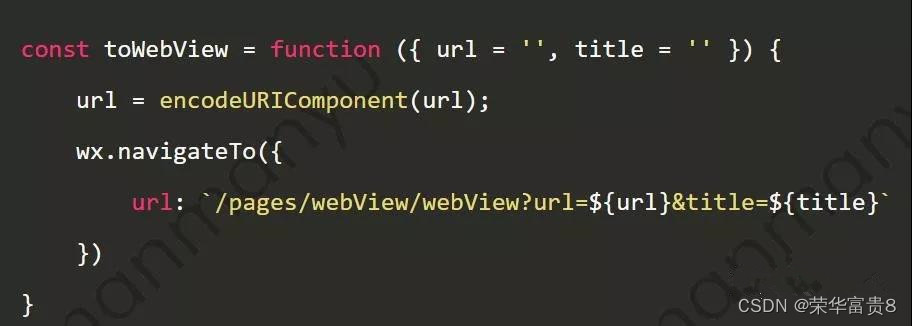 会不会有这样的场景,就是有时候需要开发一些活动或是运营页在小程序里打开,这时候就需要用到小程序的web-view组件了,而不用每次开发小程序代码然后走发布审核流程了,该组件允许加载一个H5地址的页面,并可以在该页面跳回到小程序。在web-view里打开的H5页暂不支持H5的支付方式,需要支付的话,要重新跳回到小程序页再拉起小程序的支付来完成支付。我这边的写法是编写一个跳转的webview,后台配置相应的运营或是活动地址,获取该地址然后调用公共的webview完成跳转,跳转公共函数如下: