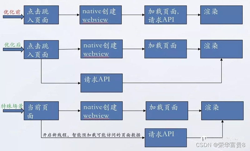 另一种优化是在特定的场景下,即比较明确可以预知到当前用户会访问哪个页面,然后开启一条线程,提前加载下一个页面的API数据,并把加载好的数据发送到要打开的页面处的监听函数处即可,主要是节省下API加载时间,当加载页面时就可以立马渲染数据了。